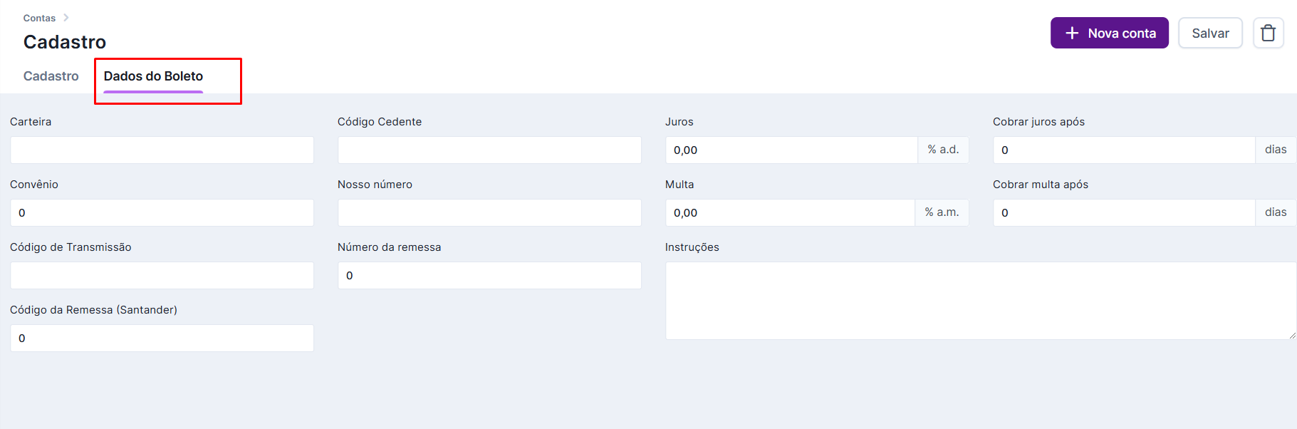 Essas configurações serão refletidas nos boletos emitidos após a inserção ou edição dos dados.