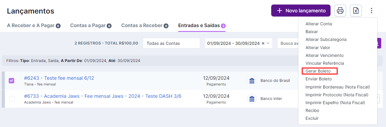 Você precisa selecionar o lançamento “a receber” no checkbox, clicar nos três pontinhos no canto direito superior da tela e na opção “Gerar Boleto” conforme imagem abaixo: