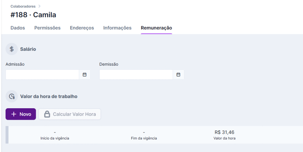 Veja como fica a aba de remuneração quando um colaborador acessa o cadastro de outro colaborador da agência com a permissão de administrador: