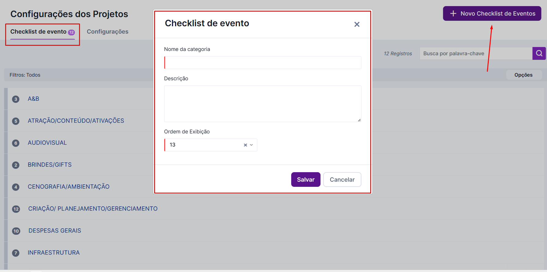 No pop-up que vai aparecer, basta inserir o nome da categoria e uma descrição do item em questão. Nessa parte, é interessante explicar o que deve ser preenchido nos campos desse checklist. Ainda é possível decidir em qual ordem os itens cadastrados aparecerão no momento da criação do Evento.Esse número é indicado, na lista, com um círculo cinza ao lado da categoria adicionada.