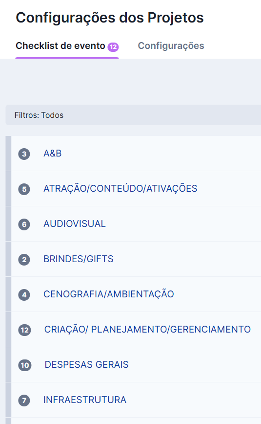 Os itens do checklist de eventos funcionam como categorias que organizam as informações de cada item a ser cotado, de acordo com o grupo ao qual pertencem.