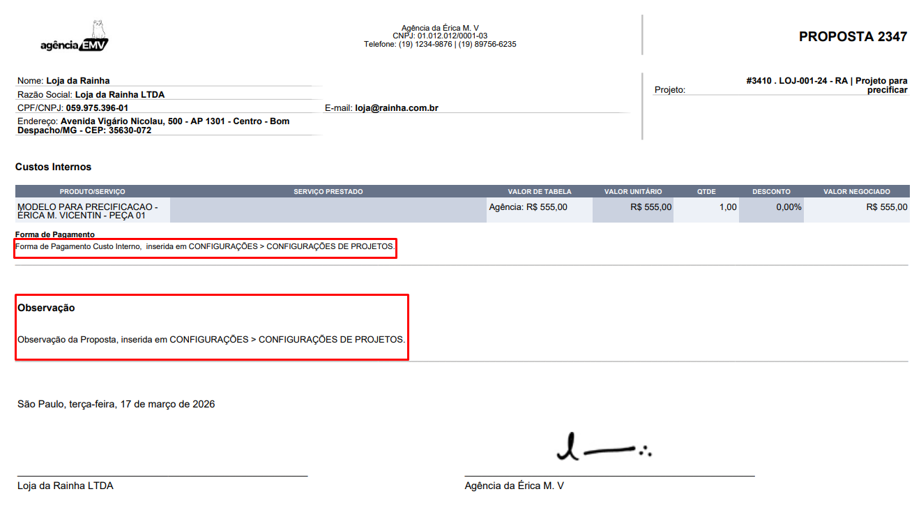 No exemplo, temos uma proposta onde um custo interno foi aprovado. Nela, apareceu o conteúdo do campo “observação proposta” e o conteúdo do campo “forma de pagamento do custo interno”: