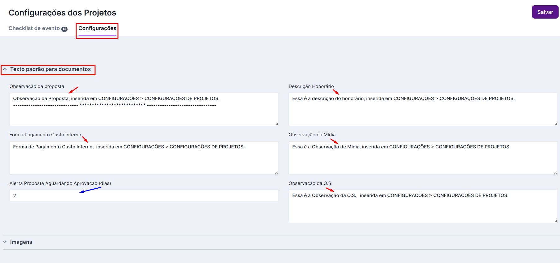 Vá em CONFIGURAÇÕES > CONFIGURAÇÕES DE PROJETOS > CONFIGURAÇÕES > Texto Padrão para documentos: