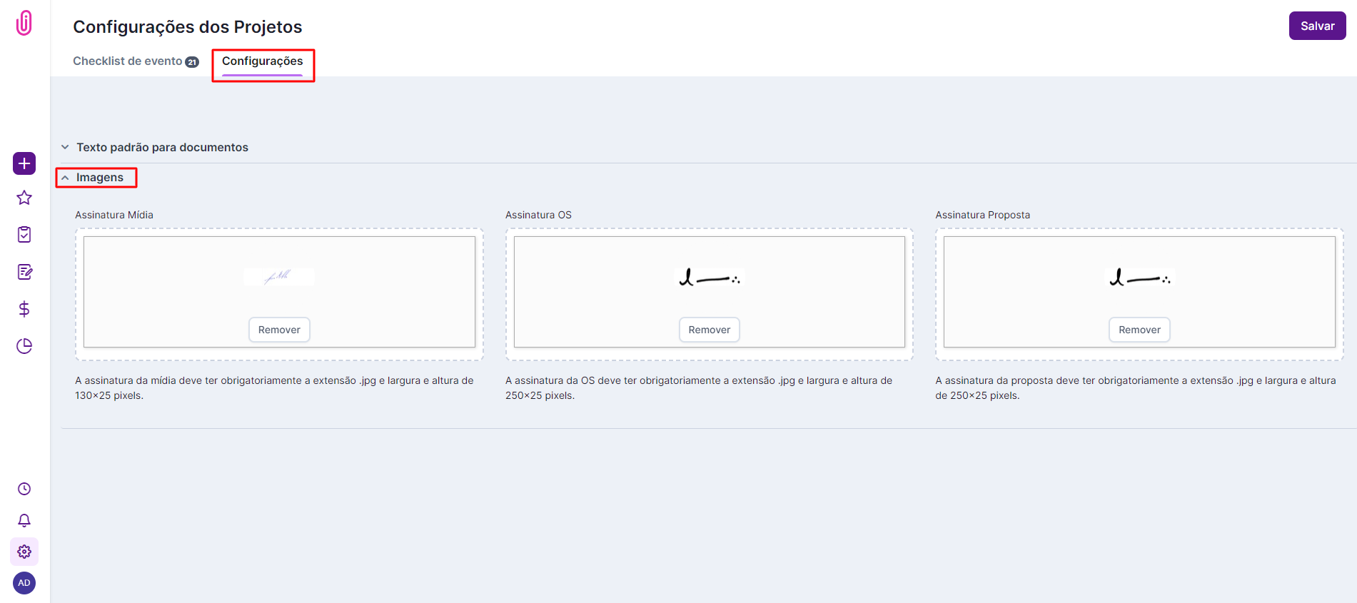 2) Dentro da tela CONFIGURAÇÕES DOS PROJETOS, você vai clicar em CONFIGURAÇÕES e, em seguida, em IMAGENS
