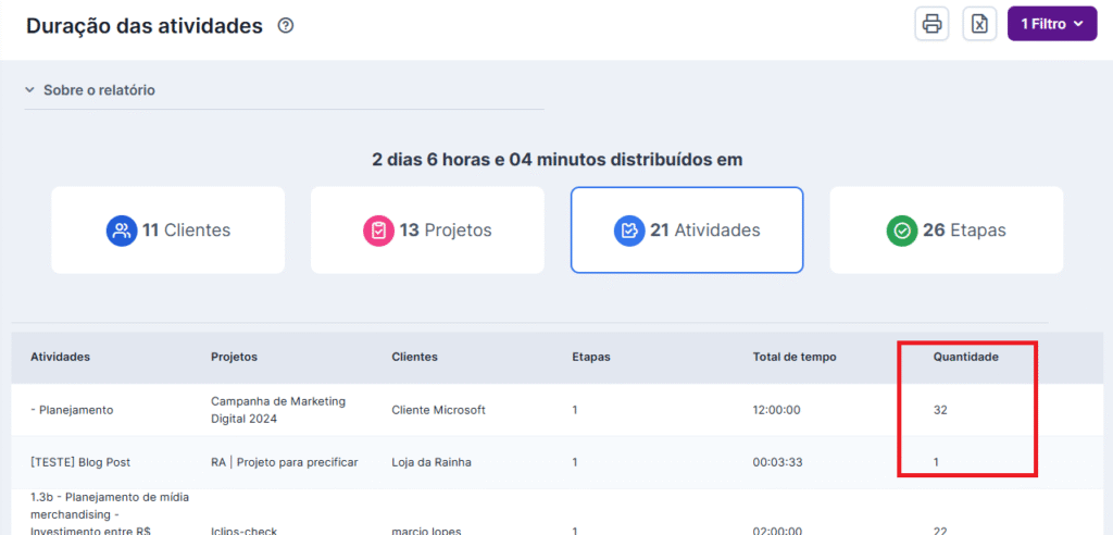 Para que a gestão seja baseada em dados reais, a coluna “Quantidade” foi adicionada às visualizações de tela e exportações (Excel e PDF) dos seguintes relatórios: