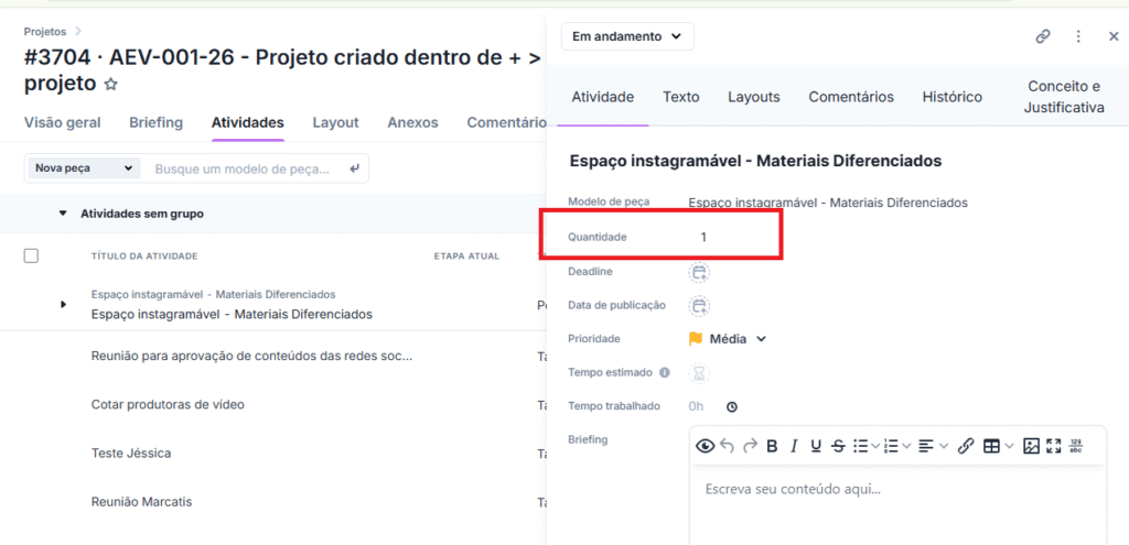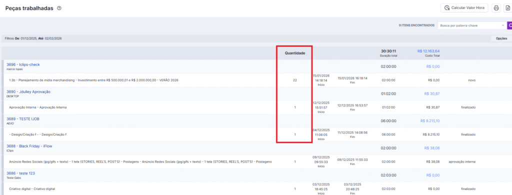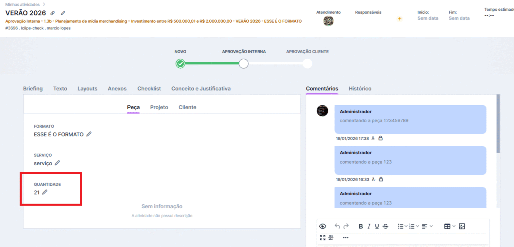 Agora o iClips permite que você detalhe exatamente o volume de entregáveis de cada peça do seu projeto. Com o novo campo Quantidade, sua equipe terá visibilidade total do esforço necessário e seus relatórios ficarão muito mais precisos.