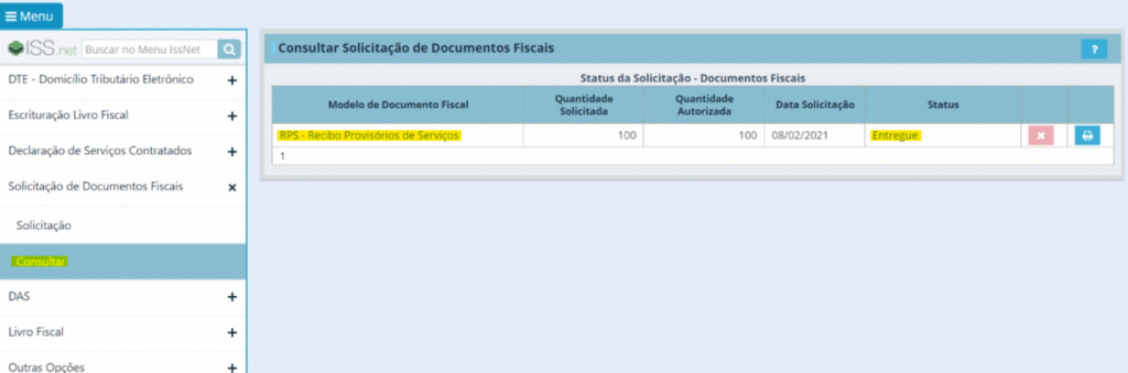 - Vá em Solicitação de Documentos Fiscais > Consultar.